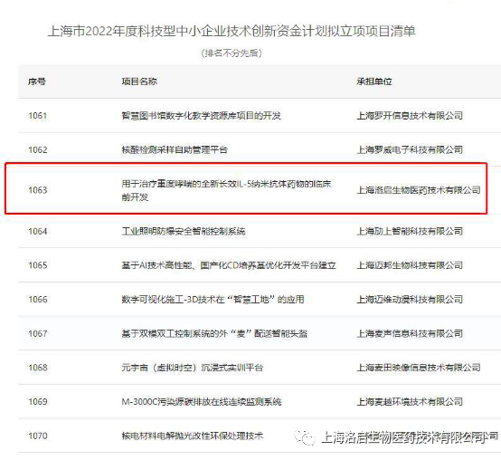 近期,上海市科学技术委员会组织的“上海市2022年度科技型中小企业技术创新资金计划”拟立项项目名单公示完毕,EVO视讯(中国)生物“用于治疗重度哮喘的全新长效IL-5纳米抗体药物的临床前开发”项目入围。